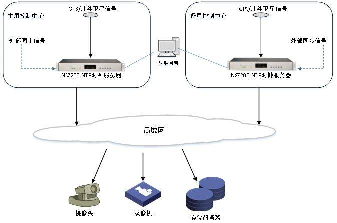 二、也是业内主流选择。即在视频监控网络内(局域网内)部署一台或多台NTP时间服务器,接收GPS和北斗时间信息,通过网口接入核心交换机,以NTP协议对局域网内设备进行授时。